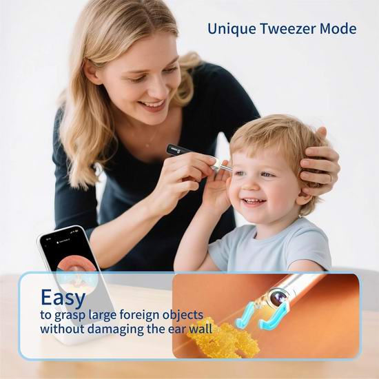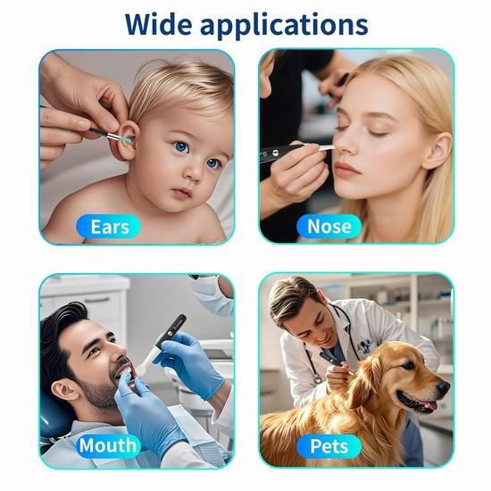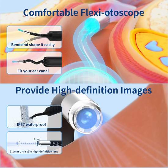 这款柔性可视耳垢可根据耳道的狭窄程度和形状轻松调节至最佳弯曲度,让您能够观察耳道的每个角落。该耳镜配备1000万像素镜头和9轴运动感应功能,可让您在3倍放大倍率下清晰地看到所有细节,使您能够安全地进行耳部检查。配有四种不同类型的耳垢勺,适用于干性耳垢和湿性耳垢。可视耳勺不仅可用于耳道检查,还可用于鼻腔、牙齿和咽喉的检查。套装包含三个观察工具(耳道观察器+鼻镜+压舌板),方便检查耳道、鼻腔和口腔。