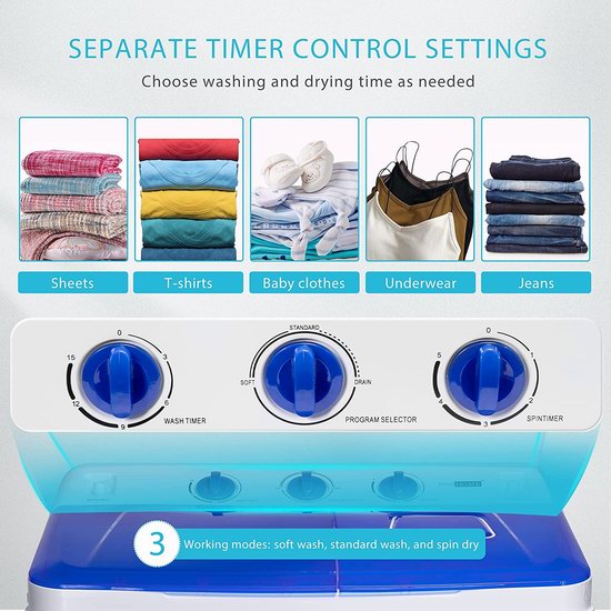 外形时尚,设计紧凑,不占空间,方便移动,省水省时省电,随心使用。包含洗衣桶和甩干桶,功能齐全,一次性可洗18磅衣物,甩干8磅衣物,非常适合作为家中的第二台洗衣机或公寓洗衣机,用于日常衣物、毛巾和宝宝衣物等的清洗。