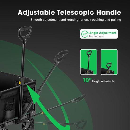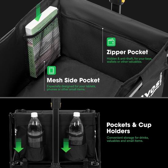 这款户外拖车采用坚固耐用的防锈钢架,最大承重95公斤。防水防撕裂的优质 PE 面料易于拆卸,方便深度清洁和维护。配有拉链侧袋和网状口袋,可存放贵重物品和小物件;两个杯架方便放置杯子和饮料​​。这款拖车配备 90° 可调节伸缩手柄,方便推拉,手柄可牢固锁定到位。配备360°旋转前轮,可平稳行驶于任何地形;坚固耐用的车轮可承受重载,增强耐用性并确保可靠的运输。