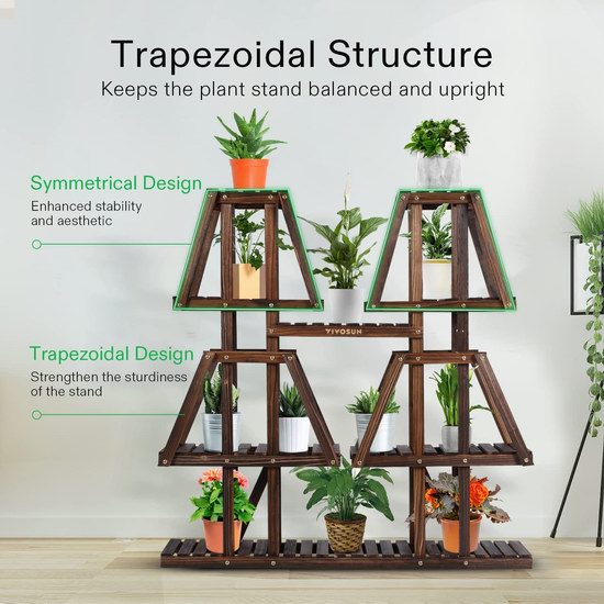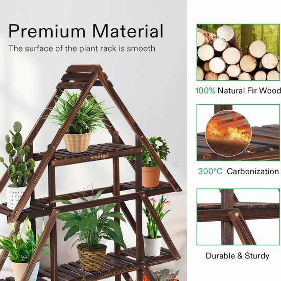 采用天然杉木制成,300°C高温碳化,涂有透明防水涂层,外观简约时尚,做工精良,对称结构,节省空间的同时,最多可容纳10盆植物。