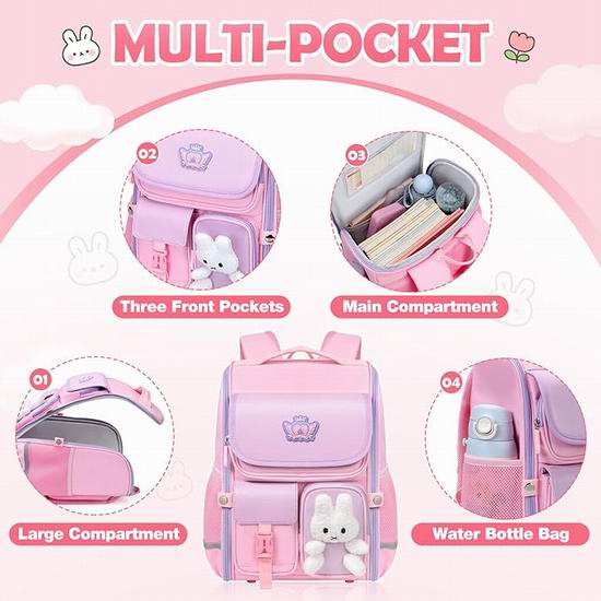 这款可爱的儿童书包,特别添加了粉色元素兔子,更适合在学校学习的女孩,激发她们的想象力和自信心,成为所有孩子羡慕的公主。超大主隔层可 180° 打开,轻松收纳儿童书籍、午餐盒和铅笔盒。背包正面还设有三个宽敞的外部口袋,可放置卡片、钥匙或零食,以及两个宽松的侧袋,方便放入大容量水杯。背包采用轻质材质设计,减轻孩子压力。加厚加宽可调节肩带和胸扣可有效平衡背包重量,保护学生脊柱,防止驼背。书包背面采用 3D 全泡沫材质,吸汗透气。