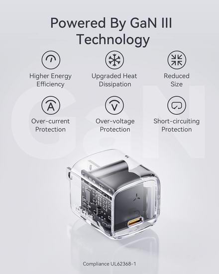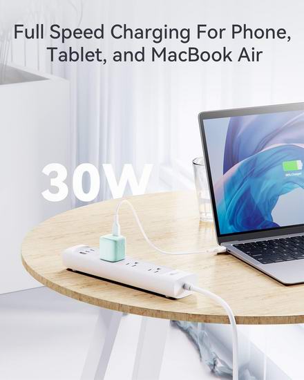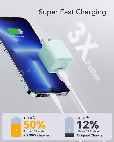 采用氮化镓 III (GaN III) 技术,与硅相比,GaN 的开关速度快 20 倍,体积和重量缩小 3 倍,功率密度高 3 倍,充电速度也快 3 倍,可在30分钟内将iPhone 14 Pro Max的电量从0%充至50%。具备短路、过压和过热保护功能,确保您的设备始终安全充电。可为手机、平板电脑、AirPods、Apple Watch等设备提供电力。