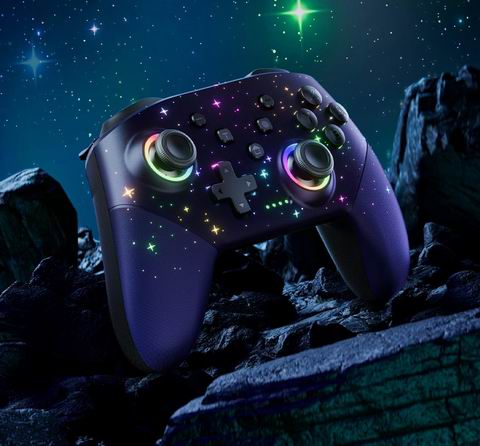 一款主打个性化星空灯光与高功能的多平台手柄。可调RGB摇杆灯环与星空透光外壳设计,并具备可编程宏按键、连发、4档震动及6轴陀螺仪。兼容Switch全系列及PC(PC需有线连接),内置1000mAh电池,提供约10-15小时续航,采用人体工学防滑握柄,适合追求颜值与自定义功能的玩家。