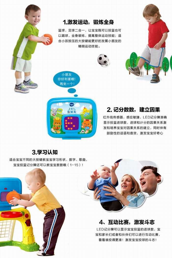 这款二合一篮球架是宝宝的运动好伙伴,它既可变身为篮球架,也可变身为足球架,是家里可移动的运动场,满足宝宝不同的运动需求。它还有Led显示屏,可以自动计分,语音播报,教宝宝数数,不仅可以和小伙伴一起互动比赛,激发斗志,也可以自己练习射门、扣篮,从小培养,做个爱好健身的小小运动达人!