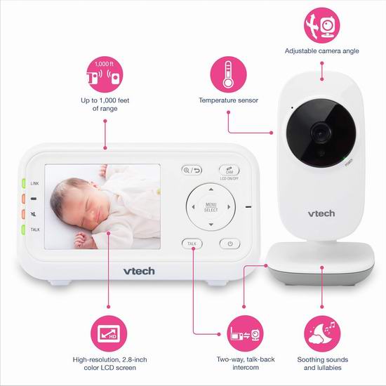 VTech婴儿监视器配备高清摄像头和2.8英寸彩色LCD屏幕,摄像头支持角度调节和2倍数码变焦,让您轻松捕捉宝宝的每个瞬间。监视器具备多种辅助功能,能够播放舒缓的声音和摇篮曲,为宝宝营造温馨舒适的环境。内置温度传感器,当婴儿房温度变化时会即时提醒您。夜视功能让您即使在夜间也能清晰监视宝宝,而 VOX 模式则帮助节省电量,同时在宝宝需要时自动唤醒。