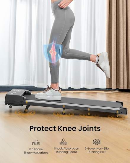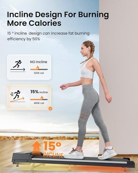 这款四合一桌下跑步机具有15°手动坡度调节功能,可以体验上坡锻炼的感觉,促进卡路里燃烧,提升训练强度。采用自动对齐跑带,宽敞的防滑表面确保您的安全,并防止在步行或慢跑时出现跑带错位。搭载2.5马力强力电机,静音运行,坚固的钢架搭配多层皮带设计,提升了减震效果并最大限度地降低了噪音,为您打造安静稳定的锻炼环境。速度范围为 0.6 至 3.8 英里/小时,提供四种可调节模式:工作模式(0.6-1.5 英里/小时)、步行模式(0.6-1.8 英里/小时)、慢跑模式(2.5-3.8 英里/小时)和爬坡模式。内置LED显示屏,可实时追踪速度、距离、时间和卡路里等关键指标。附带的遥控器可轻松调节速度或停止跑步机。最大承重可达265磅。