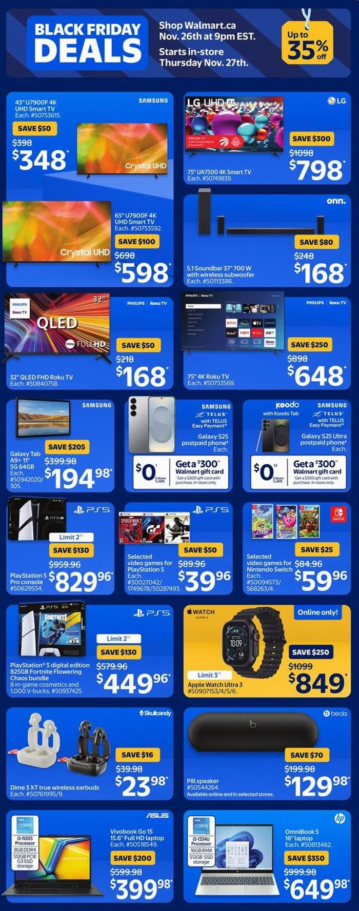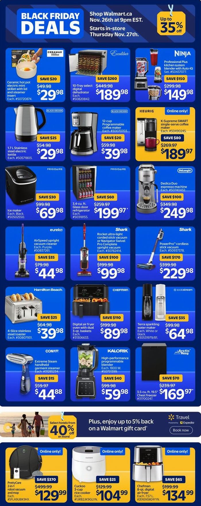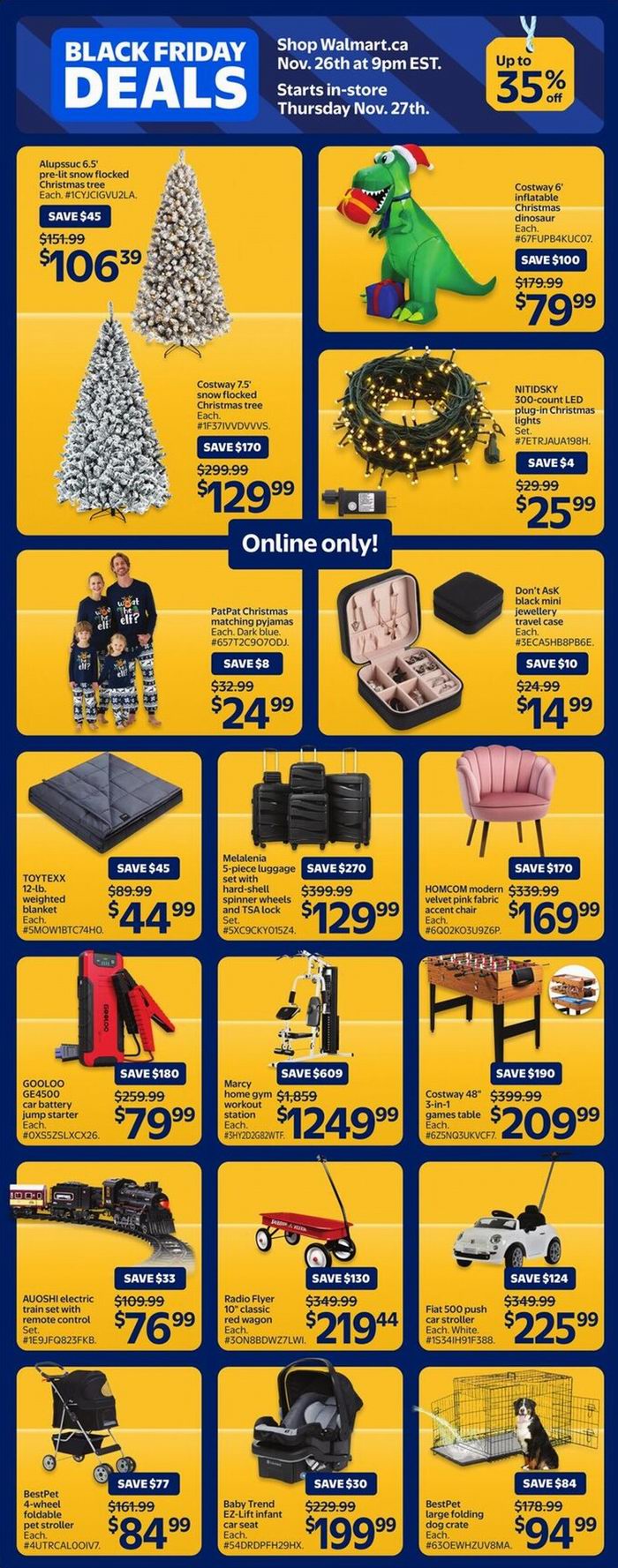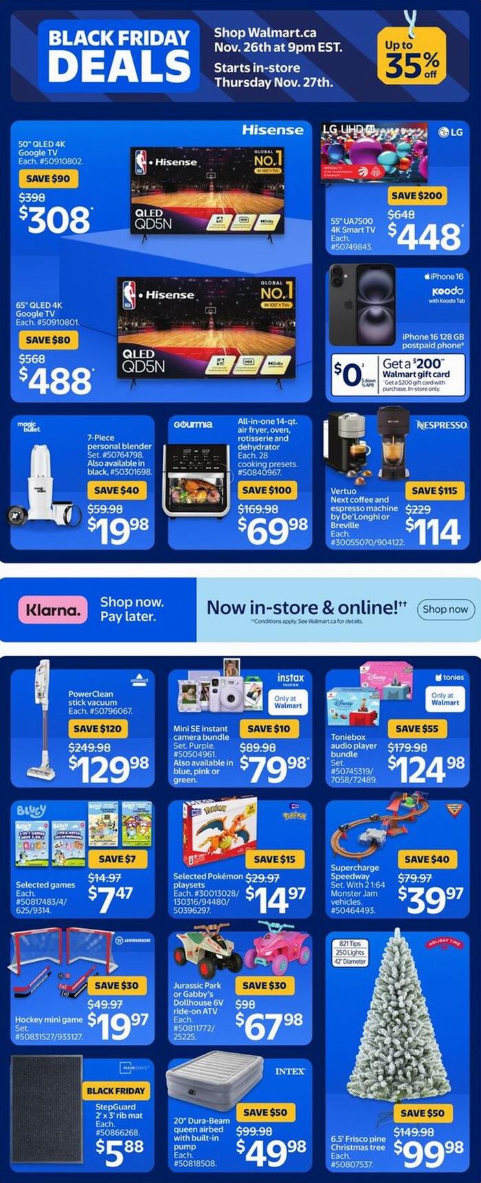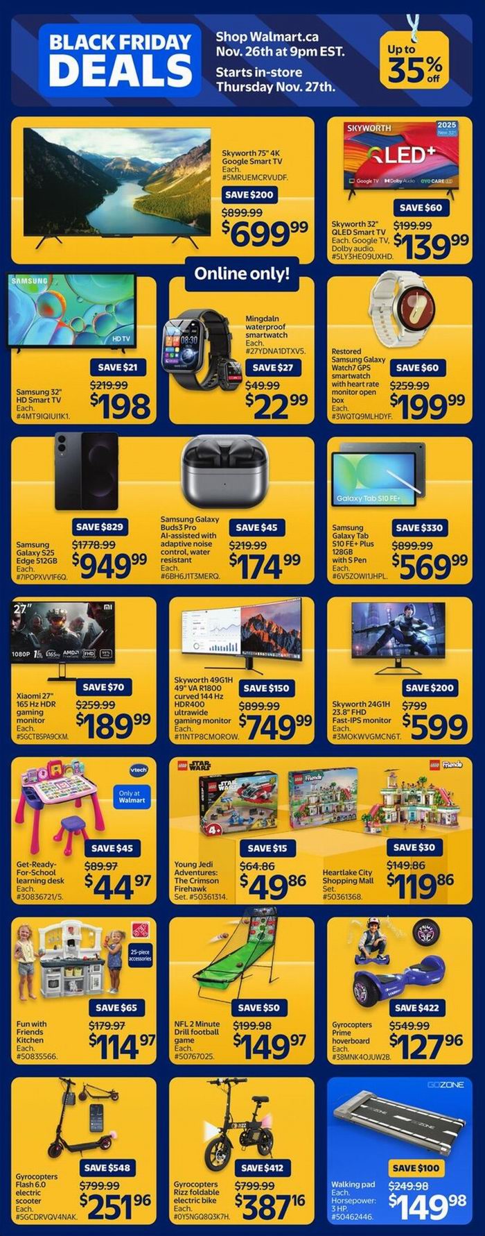 Walmart黑五大促,东部时间11月26日晚9点开卖,12月3日结束,超多商品限时促销;满35加元包邮,满25加元免费店内取货。点击进入订购页面、海报预览。