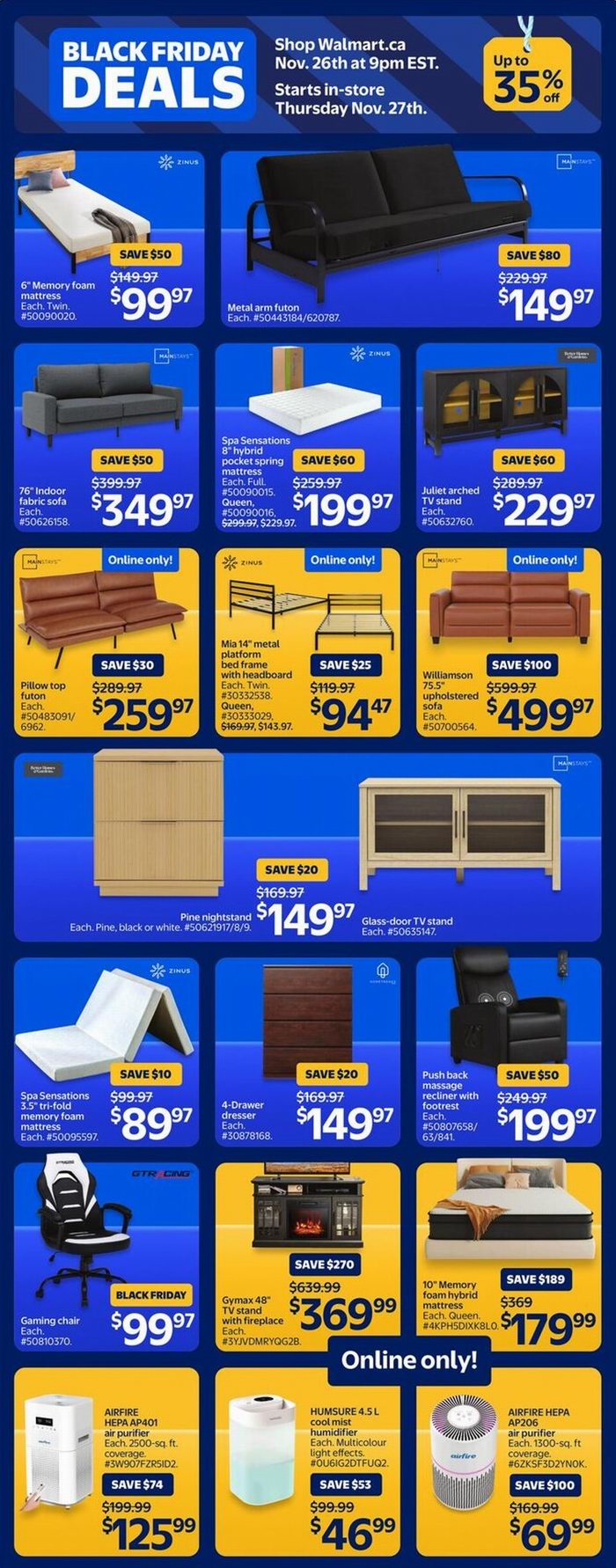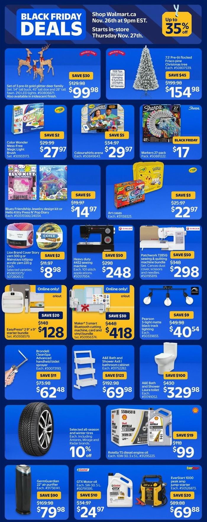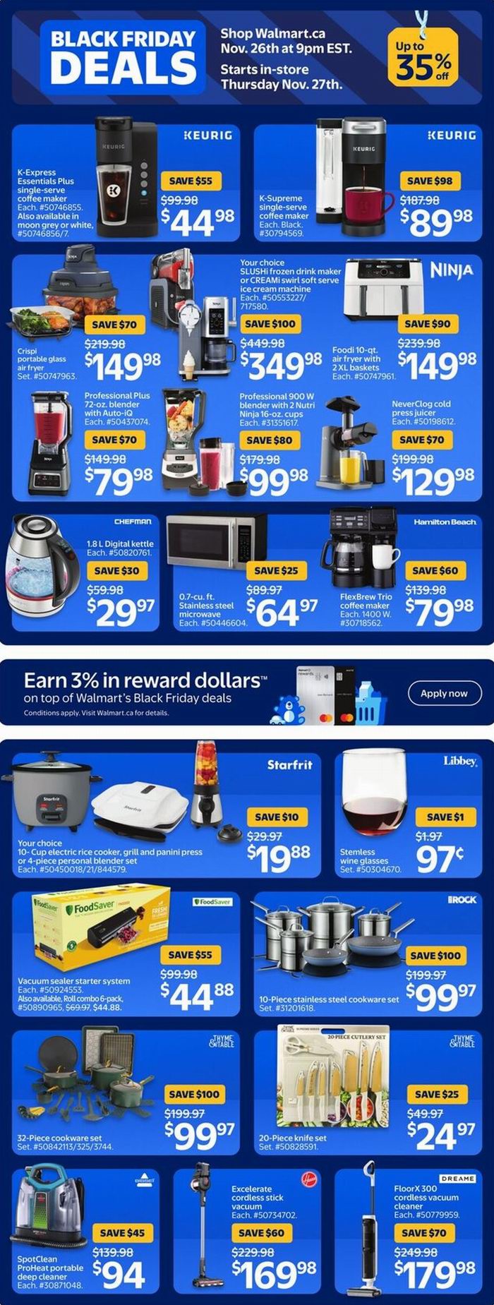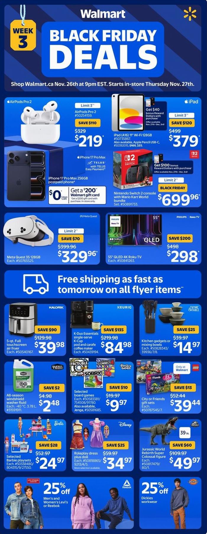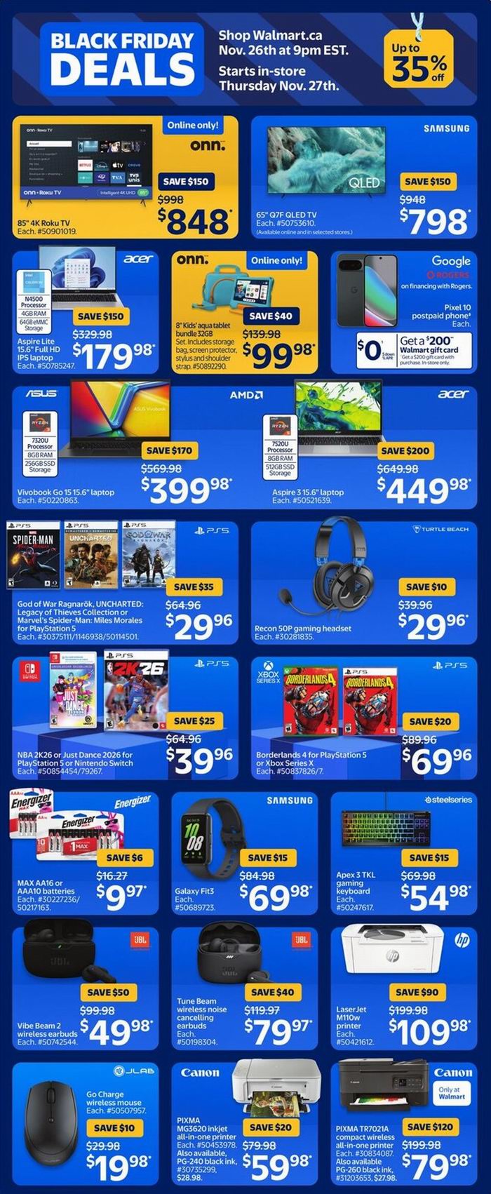 Walmart黑五大促,东部时间11月26日晚9点开卖,12月3日结束,超多商品限时促销;满35加元包邮,满25加元免费店内取货。点击进入订购页面、海报预览。