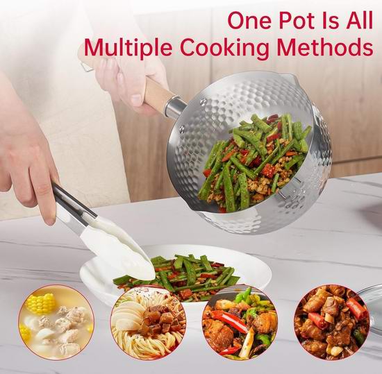 这是一款集炖、煎、炸、蒸一体的多功能锅,可以用来加热牛奶、煮面、炖蔬菜、蒸地瓜玉米、炒米饭、蒸菜、蒸馒头。采用食品级不锈钢,不易生锈,无害涂层,可放心使用。锅壁非常薄,传热迅速,光滑的内壁不易沾染污渍,易于擦拭清洁。木柄握感舒适牢固,适用于燃气灶、电磁炉、电炉和陶瓷炉,不可放入洗碗机/烤箱/烤架。