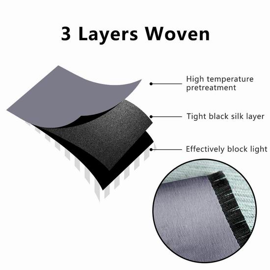 采用优质面料,采用三层编织技术,平整光滑,可有效隔绝85%-99%光线和紫外线,降低60%室外噪音,并减少夏季冷气和冬季暖气的热损失,可以机洗,窗帘宽度为52英寸(1.32米),高度62英寸(1.57米),另有黑色高度84英寸(2.13米)款清仓。