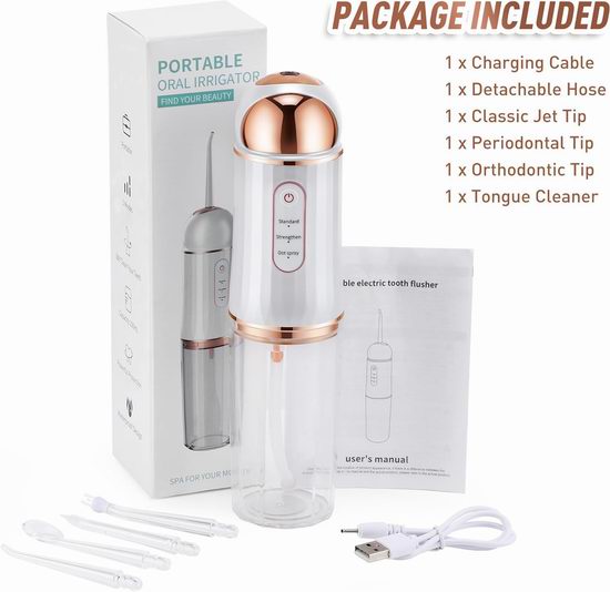 这款水牙线具有柔和、正常、脉冲3种模式,配备4个喷嘴,能精确清洁口腔每个角落,适应不同用户的需求,促进牙齿和牙龈健康。采用IPX7级防水设计,可在浴室使用并可直接水洗。内置锂电池,经4-6小时充电可持续使用20天。使用时,先装上喷嘴,填充水箱,放入口中对准清洁区,短按开机,长按2秒切换模式。