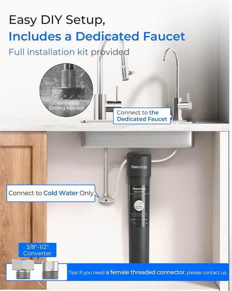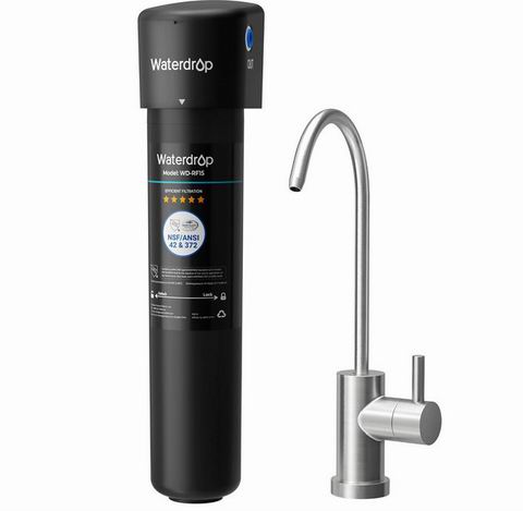 Waterdrop 15UB 厨下式净水系统:多级过滤可有效降低铅、氯及异味等杂质(并可宣称对 PFAS/重金属等有过滤能力),配专用无铅拉丝镍/不锈钢独立水龙头;滤芯寿命最长约 24 个月或 19,000 加仑,具备更大过滤面积以降低堵塞风险;材料通过 IAPMO 的 NSF/ANSI 372(无铅)与 NSF/ANSI 42(去氯/异味)认证,并经第三方测试符合 NSF/ANSI 53 的去铅要求,推入式接头与旋转锁定设计实现快速安装与免工具换芯。