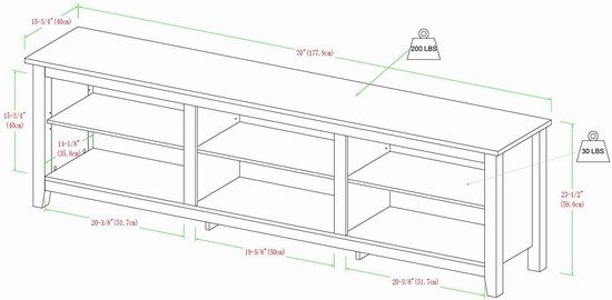 采用高级MDF中纤板材质,质地光洁,双层设计,隔板高度可调,适合70英寸以内的电视,最大承重250磅,外形尺寸为40.64 x 177.8 x 60.96厘米。