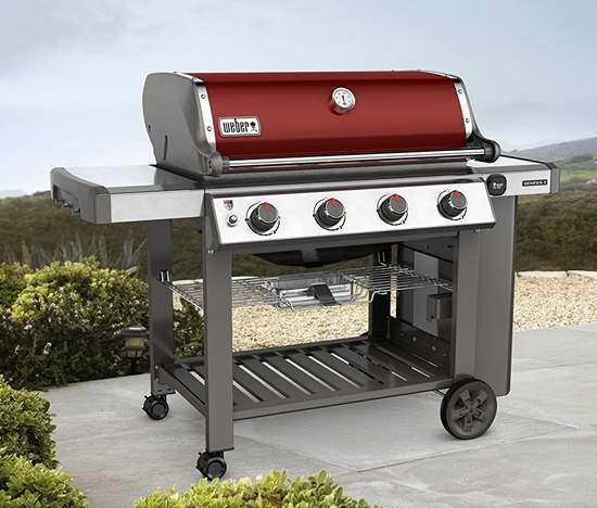 Weber Genesis是北美最为流行的一款烧烤炉之一,它以坚固的结构,性能,美观的外形著称。4个高性能不锈钢炉头从左至右排列,控制温度的按钮设立在烤炉前端。烹饪区及保温区面积分别为646、198平方英寸,每小时高达48,000 BTU的热量,陶瓷珐琅铸铁炉排,内置温度计,左右两侧设有不锈钢操作台,内置6个炊具挂钩。