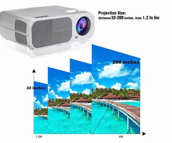 采用20,000小时超长寿命LED灯,亮度高达2600流明,支持AV, USB, VGA, HDMI, YPBPR, TV等多种输入方式,与笔记本电脑、游戏机、台式机、机顶盒、DVD播放器、摄像机、监视器等连接后播放电影、视频或游戏。物理分辨率800 x 480,最大支持1080P视频,通过调整与墙面距离(1.2-6米),可实现32-200英寸屏幕的投影,内置音箱,带3.5mm音频输出插孔。最佳投影距离2.6米,投影尺寸80英寸。