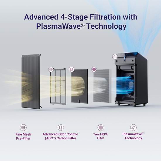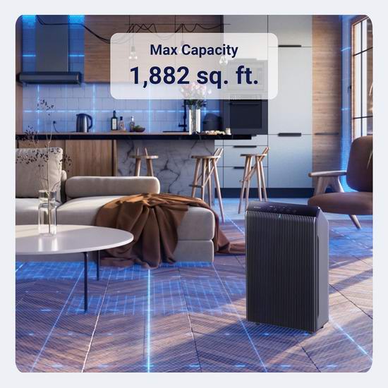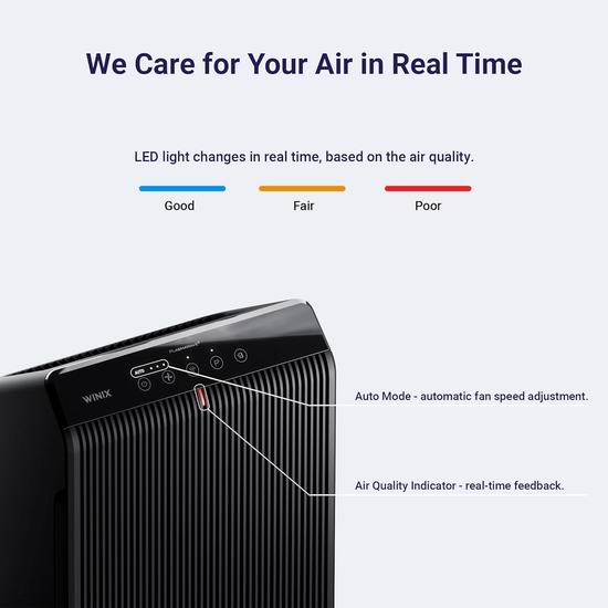 Winix 5510 智能空气净化器采用四重空气净化系统,可去除 99.99% 小至 0.01 微米的空气颗粒物,减少烹饪、宠物和烟雾产生的挥发性有机化合物 (VOC) 和室内异味,可在1小时内可清洁1882平方英尺的房间。采用PlasmaWave® 技术有助于减少空气中的污染物和杂质。内置智能传感器,可检测并监测您环境中的空气质量,并以可视化的方式呈现当前空气质量。在自动模式下,设备会自动调节风扇速度,以确保高效节能的净化效果。当房间光线变暗时,设备会自动进入睡眠模式,实现静音节能运行。内置WiFi,使用 Winix Smart App 随时随地控制设备。