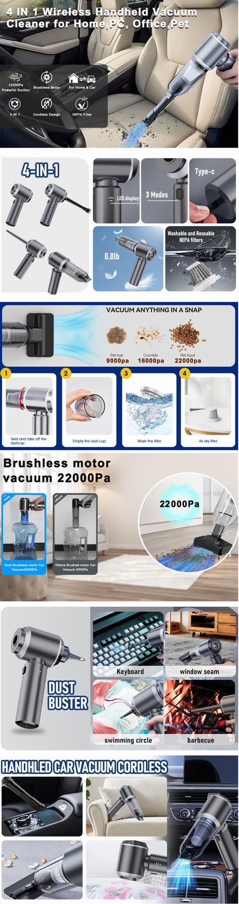 车里那种“永远吸不干净的角落”,用它直接搞定,尤其是脚垫沙子和零食碎屑,真的很解压。高达 22000PA 的强劲吸力,无刷电机,集吸尘、吹尘、压缩空气、吹风等功能,一台搞定车内清洁所有场景;还可以吹走电脑键盘、汽车等缝隙处的垃圾和灰尘,清洁不留死角,让您从此告别清洁烦恼。内置6000mAh电池,可连续运行15-20分钟;配备USB-C快速充电线,3-4小时即可充满电(不含适配器,可使用任何USB充电器充电)。套装包括吸嘴和刷头、地板刷、吹风刷头和等多种工具和配件。