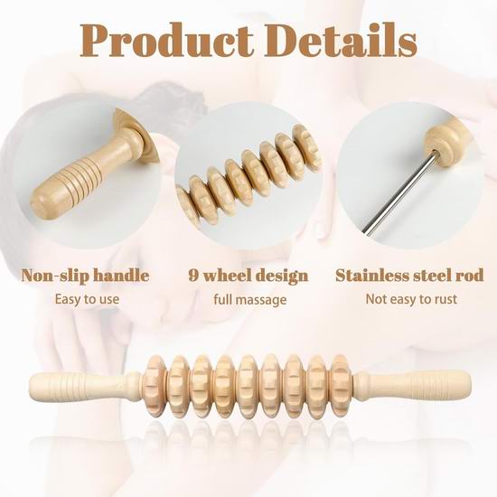 这款按摩滚轮采用优质天然榉木制成,表面光滑无毛刺,不会划伤皮肤。中心杆采用不锈钢材质,坚固耐用且防锈,确保滚轮滚动顺畅。按摩滚轮有助于放松肌肉、缓解疲劳,消除淋巴系统中的多余脂肪,并减少橘皮组织的出现。按摩棒可轻松按摩腹部、手部、腿部和背部。配备9个可旋转滚轮,表面光滑,旋转轻松,呵护每一寸肌肤。尺寸为38 x 5.9厘米。