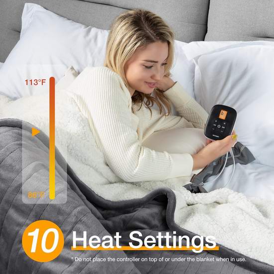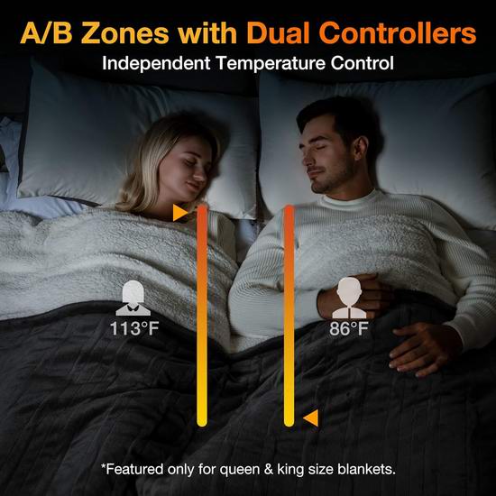 这款电热毯采用法兰绒和羊羔绒面料,4毫米短毛轻薄透气,触感柔滑亲肤,带来极致舒适体验。配备双控制器,每个控制器控制其对应的区域,可在10个温度等级(86℉ 至 113℉)之间切换,支持0.5至12小时自动关闭。电热毯采用 U 型发热丝,热量分布均匀,确保舒适体验,快速加热技术带来即时温暖。电热毯通过 ETL 认证,并配备过热保护功能,确保安全。可在40°C以下机洗,易于保养。