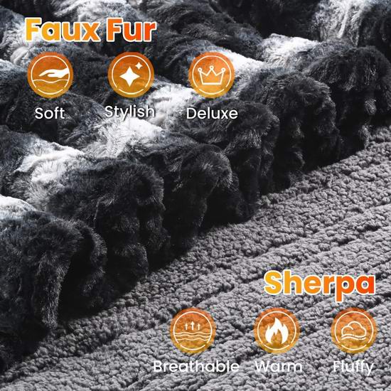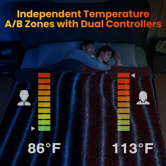 这款电热毯正面采用3D花朵图案的人造毛绒面料,反面采用夏尔巴毛材质,两面不同风格。配备两个可拆卸控制器,夫妻可以独立调整左/右区域(1-10设置,90-108℉)以满足个人需求。配备高效 PTC/NTC 敏感超细加热丝,可将热量均匀分布在整个床上,通过其快速加热功能消除冷点,并具有 0.5-12 小时自动关闭定时器。双螺旋线快速加热,防止过热。ETL认证,可轻柔机洗。外形尺寸为84 x 90 英寸。