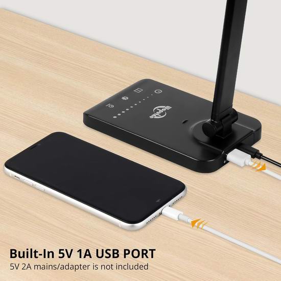 这款护眼台灯具有10级亮度和5种色温模式(3000K到6000K),可折叠设计,配备180°柔性臂和90°基轴,触摸控制,具有45分钟定时关闭功能,内置USB充电输出口,可以在使用时为手机充电。