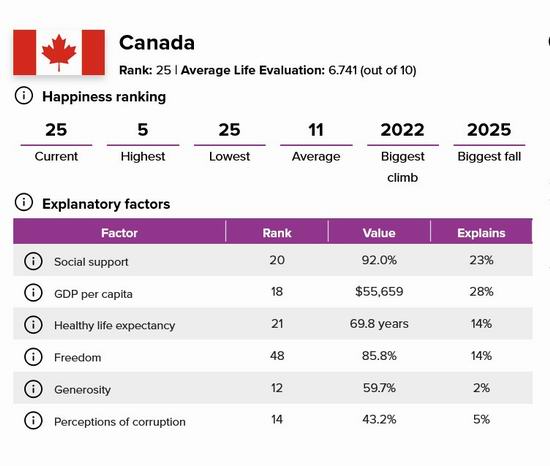 根据牛津大学幸福研究中心最新发布的《世界幸福报告》(World Happiness Report),加拿大的排名出现大幅下滑,从去年的第18位降至今年的第25位,连续三年下跌。2024年位列第15,2023年还曾是第13,如今却跌破前二十,创下十年来新低。点击查看官网原文。