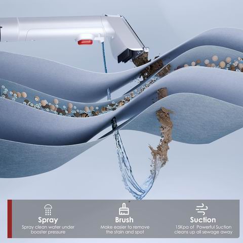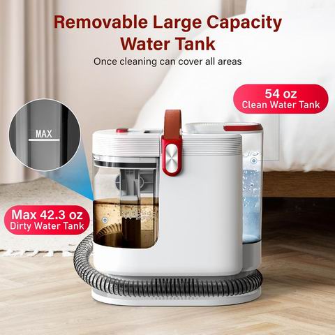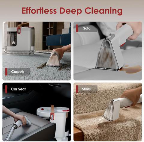 这款便携式地毯与织物清洁机(红色)搭载 500W 电机与 15KPa 强劲吸力,提供接近专业级的深层清洁效果,可高效去除地毯、沙发及汽车内饰上的顽固污渍与宠物毛发。配备三种专用清洁头(大面积清洁头、织物清洁头、精密清洁头),满足不同表面与细节清洁需求;采用双水箱设计(54盎司清水箱 / 42盎司污水箱),便于加水与排污。配有 5.5 英尺软管与 16.4 英尺电源线,移动灵活、覆盖范围广,机身轻巧易收纳,是家庭、宠物家庭及租房场景的高效多表面清洁解决方案。