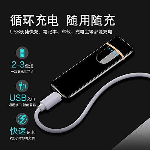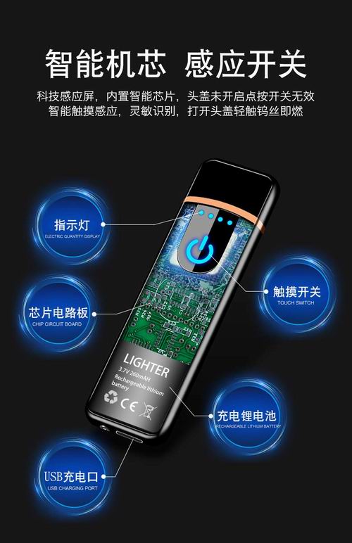 此款打火机采用锌合金纤薄外壳,坚固耐用,内置锂电池,触摸感应开关,防风无焰,双面点火,安全可靠,可在任何天气条件下使用,充电2小时,可点2包烟。