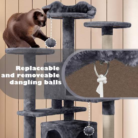 采用 0.5英寸刨花板+400g 亲肤毛绒,稳固耐用,剑麻绳包裹抓柱,满足猫咪抓挠需求,保护家具。2个隐蔽猫窝提供温暖休息空间,3个顶部平台满足猫咪攀爬天性,可舒适眺望窗外。加固底座增强支撑力,附带防倾倒配件,确保猫咪安全玩耍。挂有 2个可拆卸毛绒球,可替换成猫咪喜欢的玩具,增加游戏乐趣。提供全方位娱乐、抓挠、休息空间,让猫咪安心度过欢乐时光!