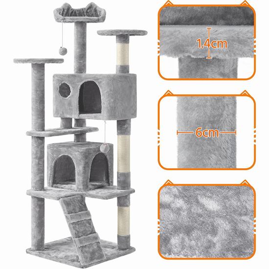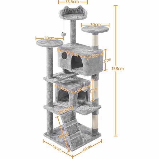 猫爬架满足猫咪喜欢待在高处,能看清周围环境的天性。由木头制作而成并覆盖人造毛皮,柱状结构则覆盖天然的草质麻绳,麻绳的气味可以让猫回归自然。这主要是为了吸引猫在上面磨爪,防止猫抓坏其它家中物品。这款带2个小型猫房间,多层平台空间让喵星人呆得更舒适。外形尺寸为49L x 49W x 157H厘米。