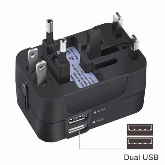 兼容全球电源插座,兼容100-240V电压,内置两个USB充电接口,可同时为两个移动设备进行智能充电。