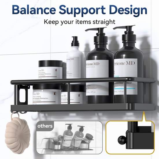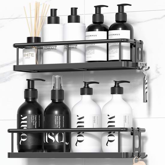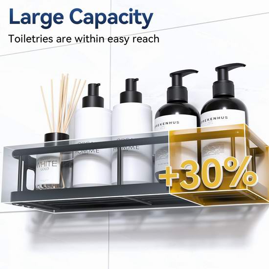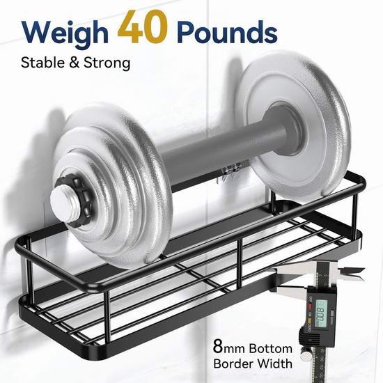 这款收纳架采用304不锈钢材质,经高温烤漆处理,防锈、防水、耐刮擦,经久耐用。中空底部设计确保通风透气,方便清洁。无需钻孔或工具,无损墙面,适用于瓷砖、大理石、玻璃、木材或金属等光滑表面,拆卸时,只需用吹风机加热粘合剂即可轻松撕下。套装包含2个不同尺寸的收纳架、4个可拆卸挂钩和2个粘胶贴片。大容量设计,轻松收纳洗漱用品或烹饪调料,充分利用有限空间,适用于浴室、厨房、房车、卧室、客厅、洗衣房等场所的收纳整理。