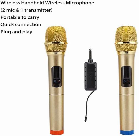 此款无线话筒采用金色合金时尚外壳,加厚金属网罩,内置高灵敏度专业动圈,无延迟,无辐射,抗干扰,心形专业拾音,可有效降低呼吸声、风声、电流声和啸叫声,配备蓝牙信号接收器,传输距离高达50米,可接入具有3.5MM或6.5MM音频接口的功放机、卡拉OK机、PA系统、电脑、手机、平板电脑、音响系统等配合使用。套装包含2个无线麦克风和1个接收器,适用于家庭派对卡拉OK、舞台表演或会议讲座。