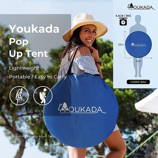 采用190T涤纶制成,防水抗撕裂,涂有不透明银色涂层,保护隐私。便携式弹出设计,取出弹开即可使用,折叠后可方便收纳于便携袋中,可用于游泳、露营、摄影更换衣物、沐浴和临时卫生间。顶部设有通风口,内置晾衣绳可挂衣服或毛巾,上方口袋可放置手机或眼镜,底部口袋可存放卫生纸或杂志。外形尺寸为41 X 41 X 75 英寸。