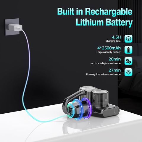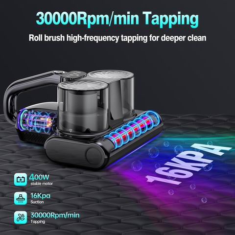采用无线设计,搭载 400W 电机与 16Kpa 强劲吸力,配合 30000 转/分钟高速滚刷、7.5 英寸加宽吸口、253.7nm UV-C 紫外线灯及超声波技术,可深层清除床垫中的灰尘、皮屑与细微颗粒;内置 4 节 2500mAh 电池,支持高低双模式切换,续航最长约 27 分钟;配备可重复使用的 HEPA 高效过滤系统,可拦截 99.97% 的微尘颗粒,并具备紫外线自动断电与滚刷防缠绕双重安全保护,结构简洁、易拆洗,兼顾高效清洁与长期耐用性。