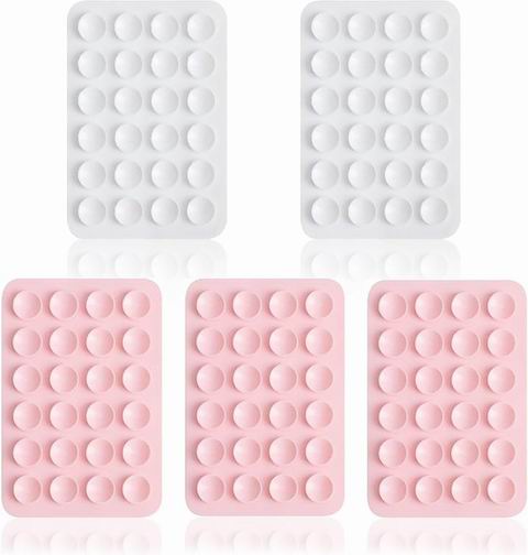 这款 5 个装硅胶吸盘手机壳支架(白色/浅粉)通过背胶固定在手机壳上,让手机可吸附在镜子、玻璃等光滑平面实现免手持拍摄、看视频或视频通话,兼容 iPhone 与安卓等主流机型,适合厨房、健身房、舞蹈室、浴室等场景;硅胶吸盘耐用防滑,但需保持表面清洁、必要时微湿以增强吸力,吸附效果与表面光滑度相关且会随时间减弱,建议单次使用不超过 30 分钟并定时按压恢复吸力;背胶贴上后通常不可拆下重复使用,且不适用于粗糙/不平整表面,建议贴在普通手机壳上避免损伤贵重壳。