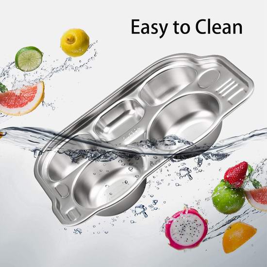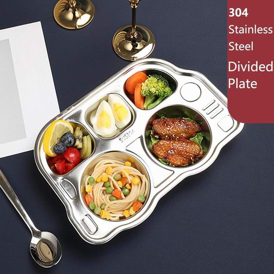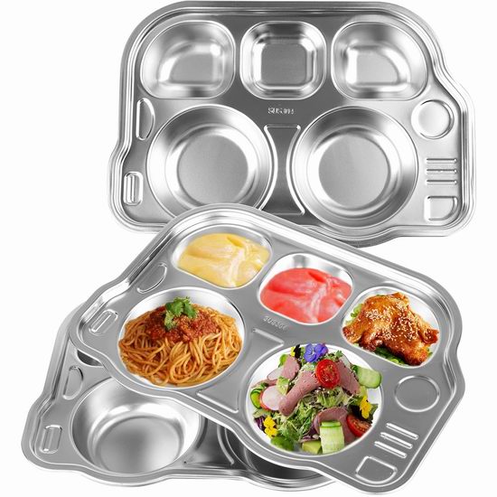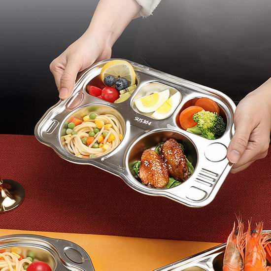 餐盘采用304食品级不锈钢制成,坚固耐用,安全无毒,不含BPA和铅,特别适合儿童使用,不易破碎。5格设计,可以分开不同食物,避免串味。单个餐盘尺寸为26.9 x 18.5厘米。