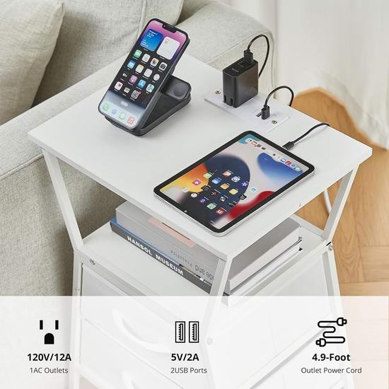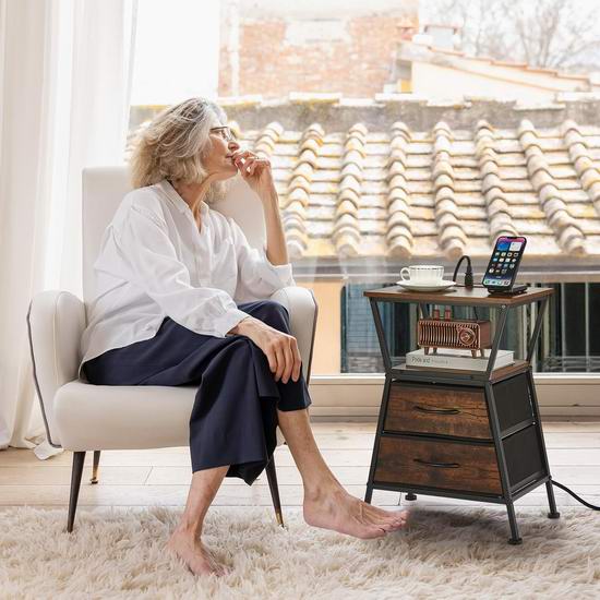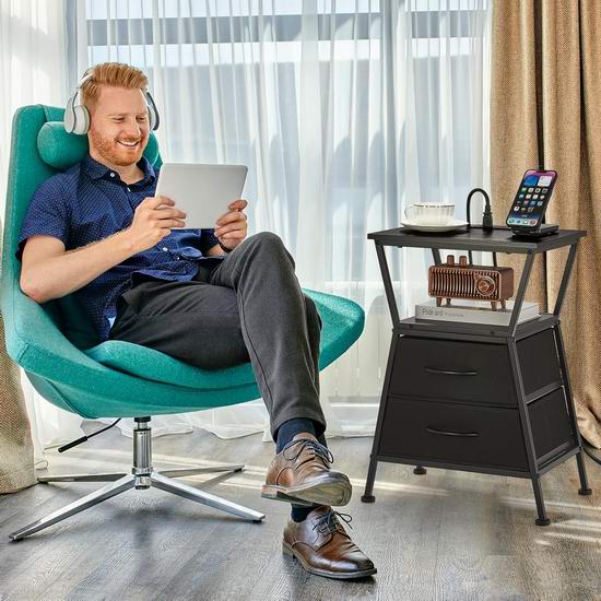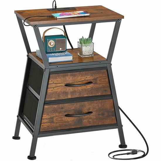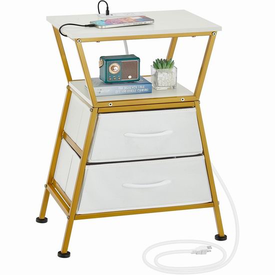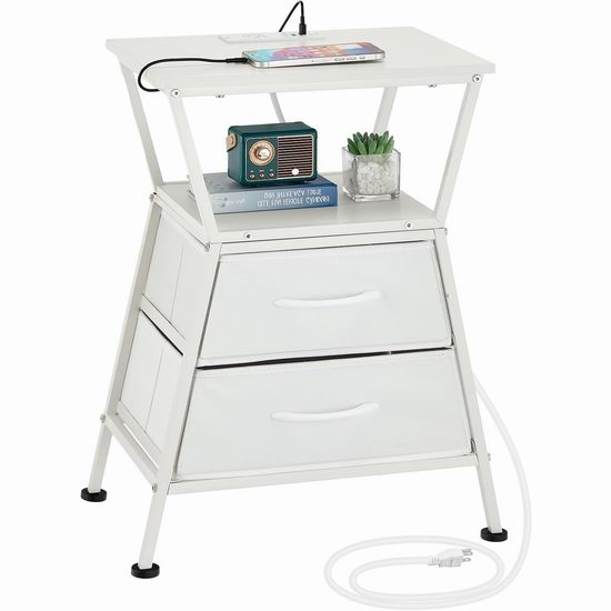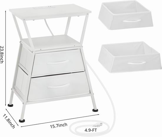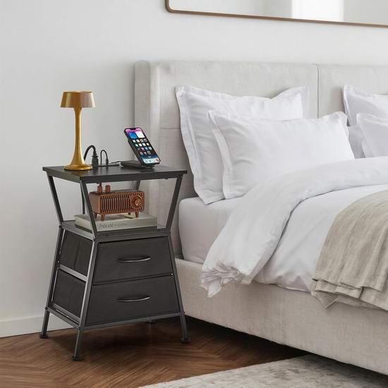 这款床头柜内置电源插线板,配备2个USB充电口和1个标准交流电插座。,可便捷地为各种设备供电。床头柜采用现代感十足且几何美感十足的梯形设计,为您的家居装饰增添一抹亮色。配备两个宽敞的布艺抽屉,助您轻松收纳杂物。整体采用金属框架和优质承重P2级刨花板制成,坚固耐用,易于清洁。外形尺寸为30 x 40 x 61厘米。