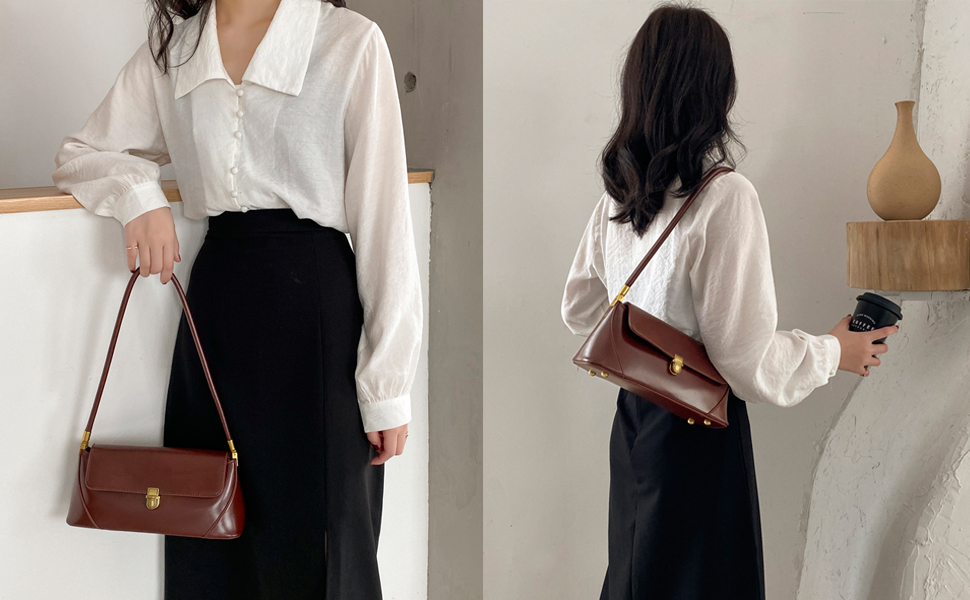 采用优质 PU皮革和尼龙衬里,搭配定制金色五金配件,兼具耐用性与优雅设计。尺寸为上部 9.05 英寸、底部 11.02 英寸(长)x 3.54 英寸(宽)x 4.72 英寸(高),手柄长度 10.63 英寸,重量仅 0.84 磅,轻便易携。包内设有一个宽敞隔层和拉链口袋,可容纳手机、口红、钥匙、现金等日常小物。纤薄简约的复古风格,搭配短肩带,适合休闲或正式场合,是日常出行的理想选择。