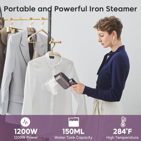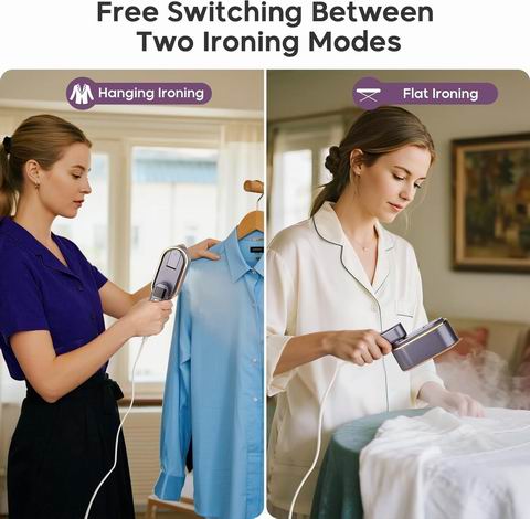 采用1200W功率实现9秒快速加热,支持干湿两用与平烫/挂烫二合一模式;其180度旋转手柄适配多角度熨烫场景,轻巧机身便于旅行携带,能安全用于丝绸至厚重夹克等多种面料。