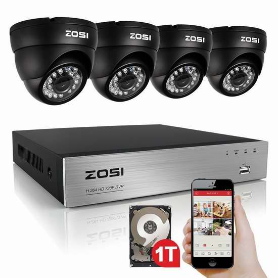 ZOSI 720P 1280TVL 4路高清监控系统+1TB硬盘套装 102.84加元限量特卖并包邮!家庭、商业安防卫士!