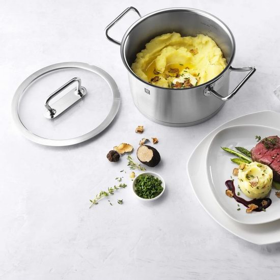 ZWILLING Pro系列产品采用SIGMABOND钢铝钢三层包覆式锅底技术,其中最厚达6.4mm的夹层铝块,使其导热性能强,传热均匀;这样保温更持久,能更省时节能。采用18/10不锈钢,使锅具保养起来更方便,也更不易刮伤;使用后很容易清洗,不会残留食物余味,更清洁卫生。超强铝制夹心层,让其导热非常均匀迅速,是一个完美的热量加速器。宽沿设计,当从锅内倒出汤汁时,不易滴落在锅身上。锅壁上有清晰的标注容量刻度,更易使用,也可用洗碗机清洁。全新不锈钢手柄,符合人体的工程学设计,握感很舒适,能够直接用于烤箱使用。