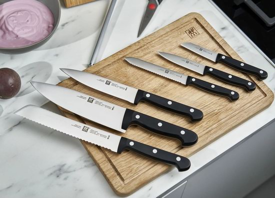 选用德国精品特殊配方无污点不锈钢制成,采用冰硬化精炼技术,使刀刃更加锋利,耐腐蚀,符合人体工学全柄设计,本套装内含刀座,磨刀棒,厨师刀,面包刀,切片刀,削皮刀,多用途刀,小刀和厨房剪刀。